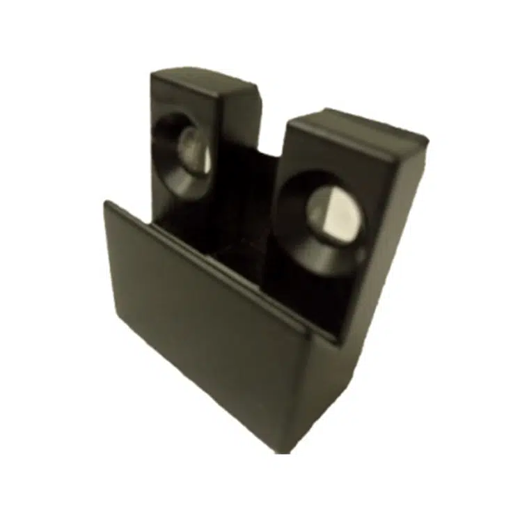 Black painted metal block, used to attach the bottom of a Herman Miller connector post to the bottom of a Herman Miller panel.