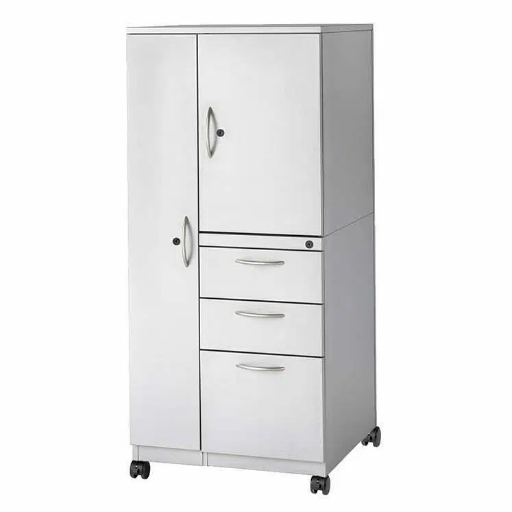 Wardrobe-cupboard tower includes three locks that are keyed alike, handles are available in the standard full pull style (other pull styles available upon request), and meets or exceeds ANSI-BIFMA standards for safety and reliability.