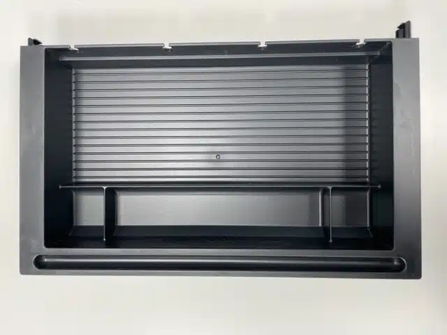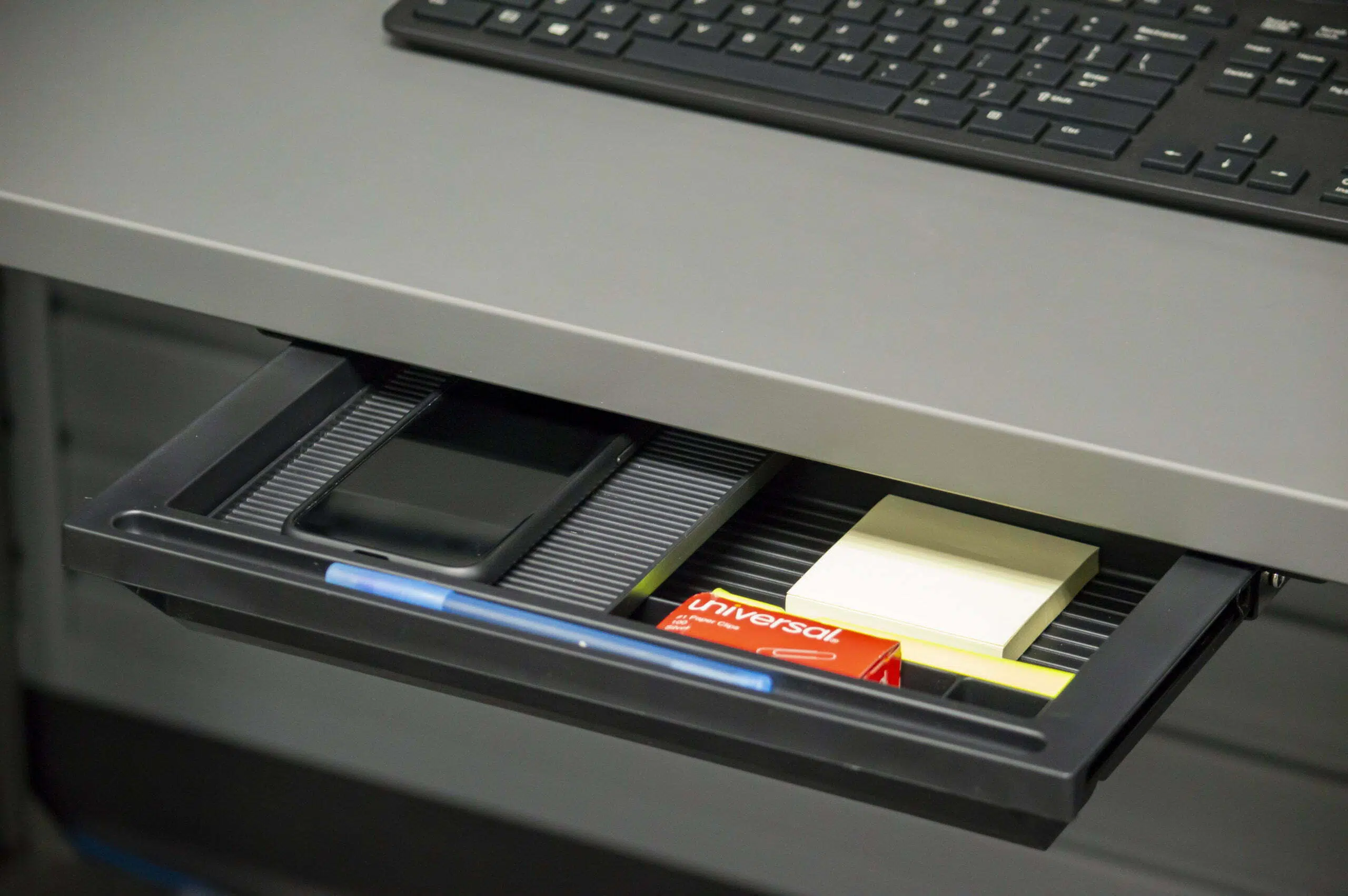 - 8″ deep x 14″ wide plastic pencil drawer with ball bearing slides.